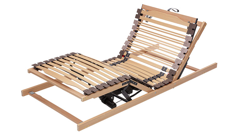 Mot Smart Ausführung als ultra flacher Motorrahmen mit Rücken- und Fußverstellung als Problemlöser für Bettkästen und Schubauszüge. Die motorischen Antriebe sind im Fußbereich integriert. Zusätzliche Stabilisierung durch Metallstreben. Gleichmäßiger Antrieb über beidseitigem Seilzug. Schulterkomfortzone durch extraweiche Kappen (keine Mechanik), Rahmenhöhe: ca. 10,5 cm, Kabel- oder Funksteuerung
